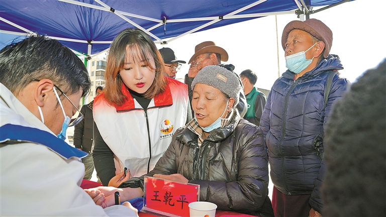 為進一步深化社區(qū)養(yǎng)老服務體系建設,切實回應老年人的健康關切,近年來,城關區(qū)奪底街道桑伊社區(qū)聚焦重點服務群體,創(chuàng)新探索“黨建引領+志愿服務+專業(yè)醫(yī)養(yǎng)”三位一體助老服務新模式,取得良好成效。圖為三沐醫(yī)養(yǎng)專業(yè)人員與桑伊社區(qū)“布谷響鈴”志愿者協(xié)同配合,為轄區(qū)老年人免費開展健康指標監(jiān)測。記者 鹿麗娟 攝