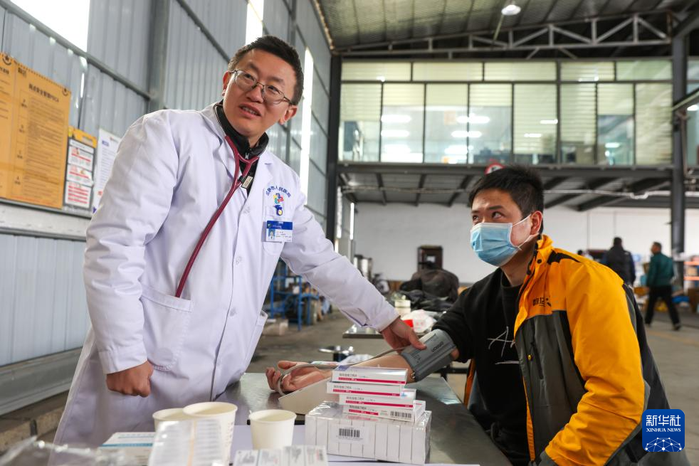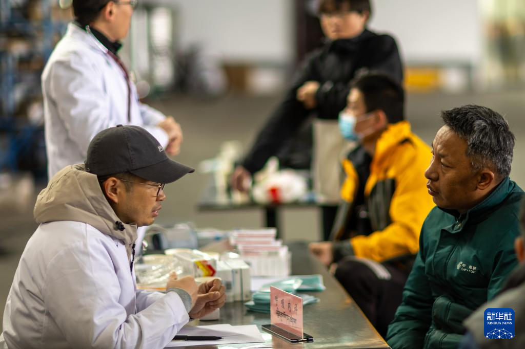 3月13日,來自首都醫(yī)科大學(xué)附屬北京天壇醫(yī)院的神經(jīng)外科專家郝強(qiáng)(左二)為快遞從業(yè)人員義診。新華社記者 姜帆 攝