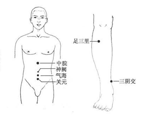 位于腹部正中線,臍下一寸五??煞乐蜗赂共刻弁?、大便不通、泄痢不止,遺尿、遺精、陽痿、滑精,閉經、崩漏、帶下、子宮脫垂,中風脫證、脘腹脹痛、氣喘、疝氣,失眠、神經衰弱、腸炎等。