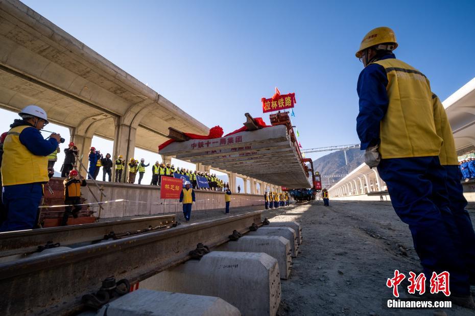 12月31日,拉林鐵路最后一段軌排鋪設(shè)現(xiàn)場。當(dāng)日,在西藏林芝市尼洋河畔的新建林芝火車站,川藏鐵路拉薩至林芝段(拉林鐵路)最后一段軌排順利鋪設(shè),這標(biāo)志著拉林鐵路399.61公里的正線軌道全部鋪通,西藏東南地區(qū)結(jié)束無鐵路歷史。拉林鐵路起自西藏自治區(qū)首府拉薩,終點為林芝市,正線全長435.5公里,新建正線403.1公里,系西藏首條電氣化鐵路,設(shè)計行車速度為160km/h,全線計劃于2021年6月30日建成通車。中新社記者 何蓬磊 攝