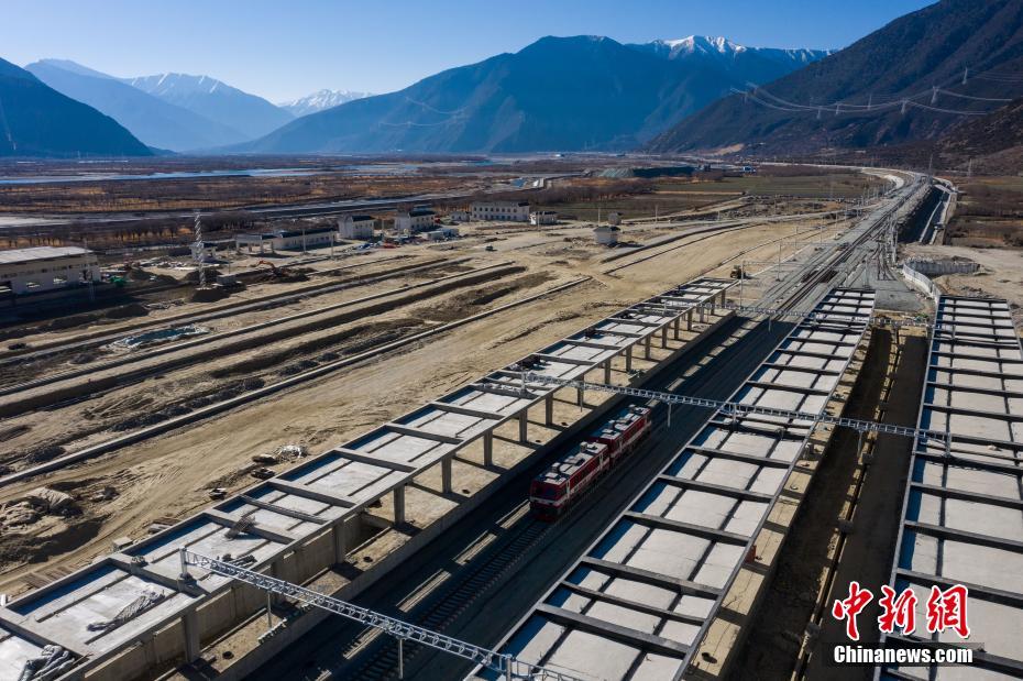 12月31日,中鐵十一局軌道車通過鋪設(shè)完成的拉林鐵路林芝站。當(dāng)日,在西藏林芝市尼洋河畔的新建林芝火車站,川藏鐵路拉薩至林芝段(拉林鐵路)最后一段軌排順利鋪設(shè),這標(biāo)志著拉林鐵路399.61公里的正線軌道全部鋪通,西藏東南地區(qū)結(jié)束無鐵路歷史。拉林鐵路起自西藏自治區(qū)首府拉薩,終點為林芝市,正線全長435.5公里,新建正線403.1公里,系西藏首條電氣化鐵路,設(shè)計行車速度為160km/h,全線計劃于2021年6月30日建成通車。(無人機(jī)照片)中新社記者 何蓬磊 攝