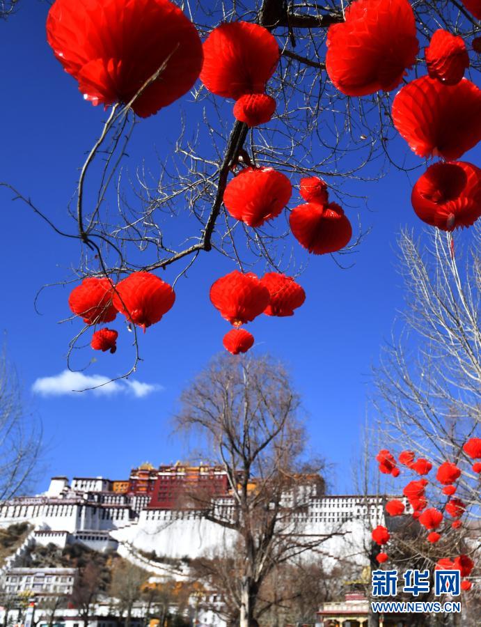 2月8日拍攝的布達(dá)拉宮前迎接春節(jié)和藏歷新年的吉祥裝飾。新華社記者 覺果 攝