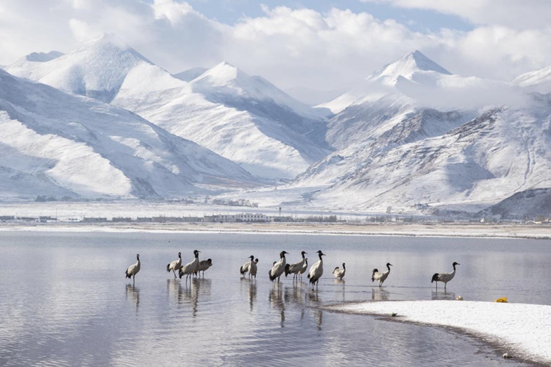 雪后拉薩林周,黑頸鶴越冬地。欒亞立攝