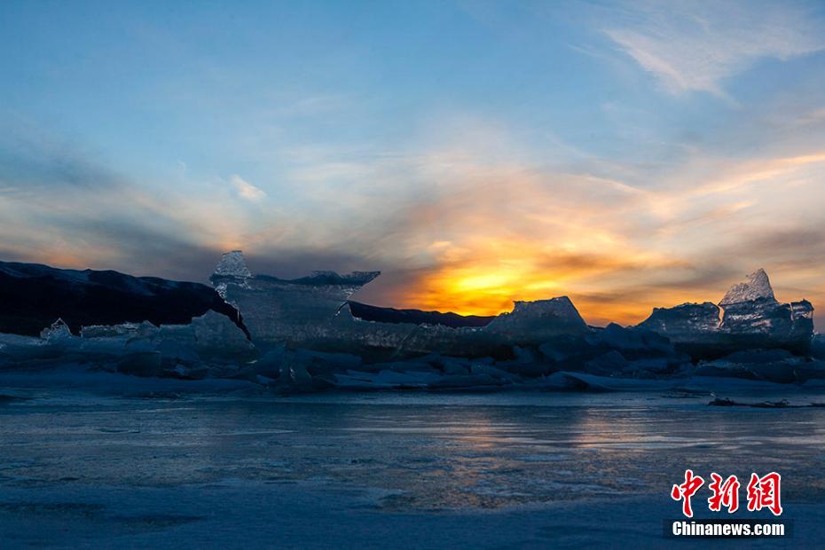 湖面上隆起的冰塊也在夕陽(yáng)照射下波光粼粼,勾勒出一幅絕美畫(huà)卷。趙海梅 攝