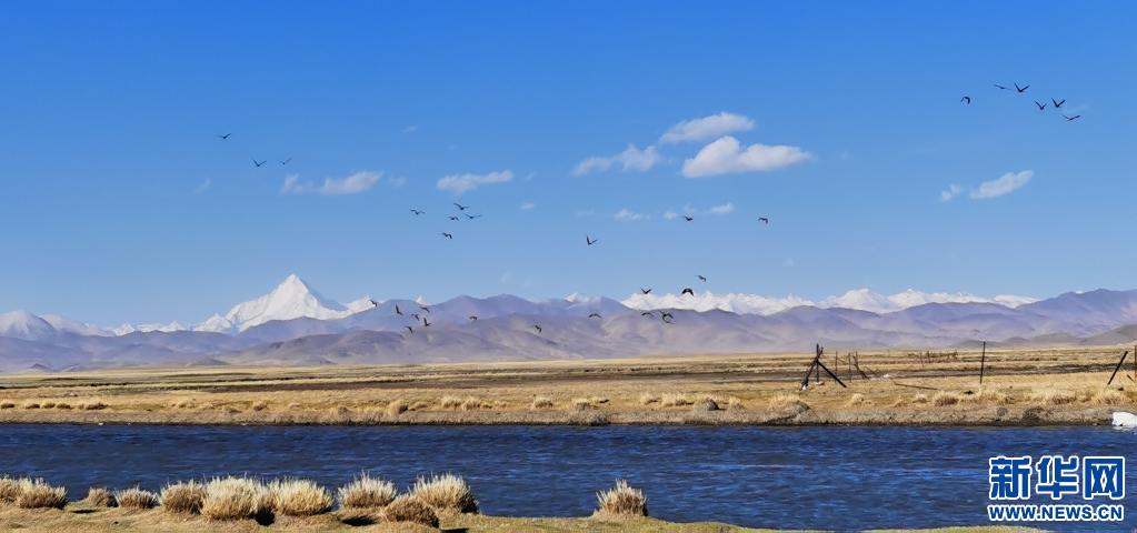 5月16日,在西藏仲巴縣里孜口岸附近,一群斑頭雁飛翔在湖泊和雪山之間(手機(jī)照片)。新華社記者 沈虹冰 攝