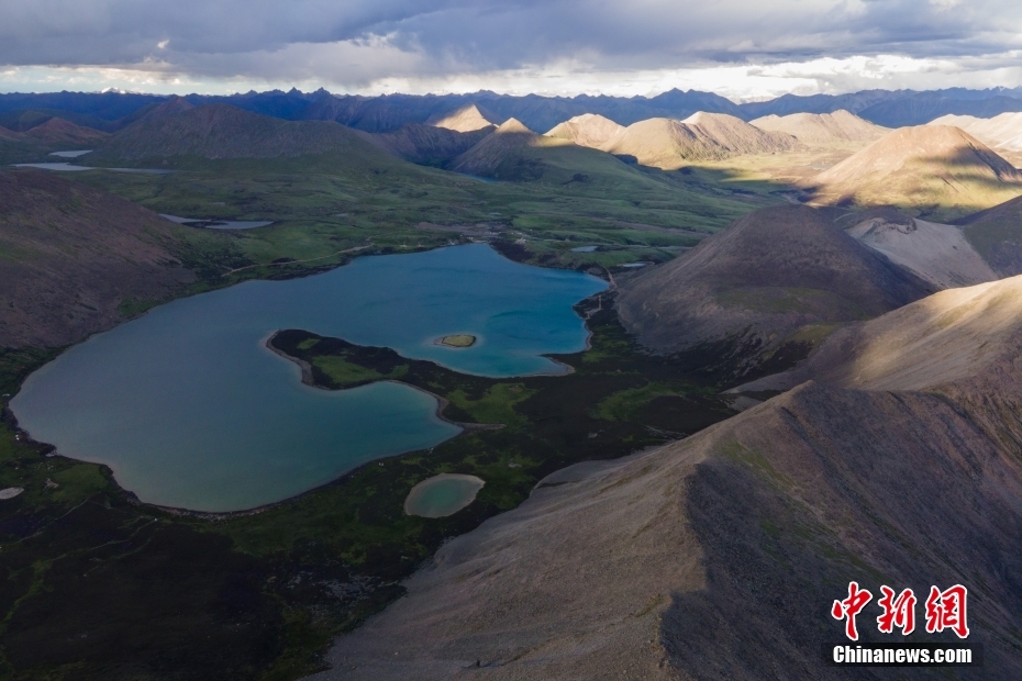 6月23日,思金拉措湖邊高原山脈風光。思金拉措位于西藏墨竹工卡縣日多鄉(xiāng),海拔4500多米,周邊群峰簇擁,地形猶如聚寶盤,不少民眾將其稱為西藏的“財神湖”。(無人機照片) 中新社記者 江飛波 攝