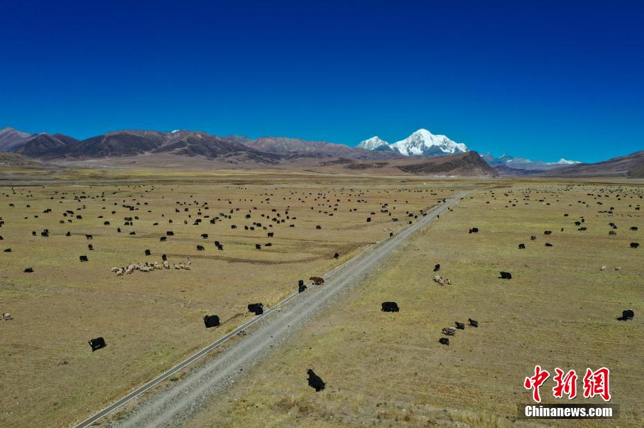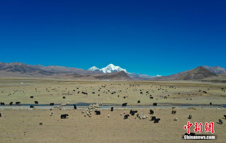 圖為瓊穆崗嘎雪山腳下成群結(jié)隊的牛羊。(無人機照片) 貢嘎來松 攝
