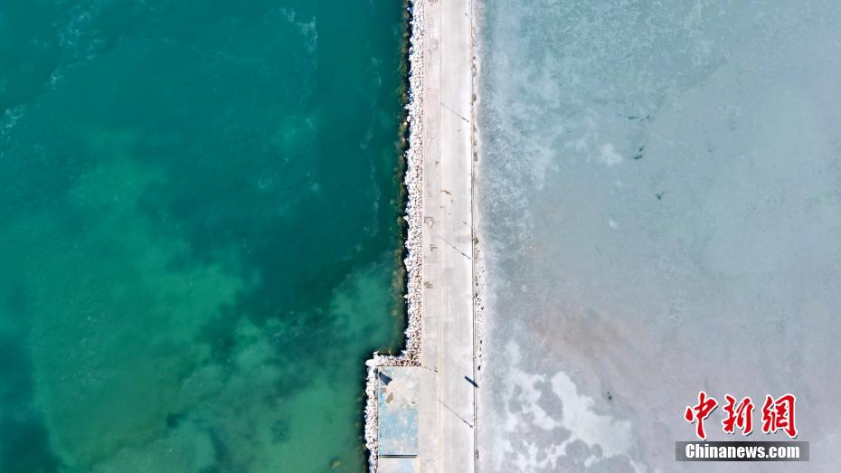 12月21日,航拍冬日青海湖。冬日青海湖周圍的積雪將湛藍的湖面包裹起來,不斷上凍的湖面猶如一面鏡子。(無人機照片) 中新社記者 李江寧 攝