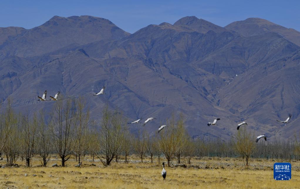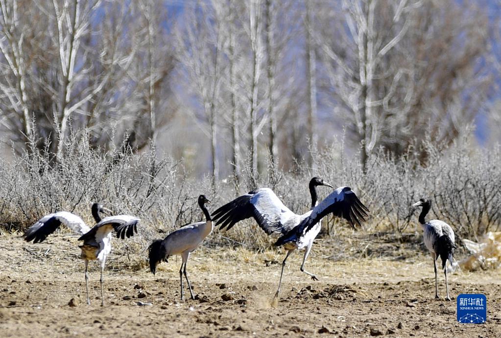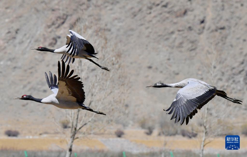 這是在南木林縣境內拍攝的黑頸鶴(3月29日攝)。新華社記者 張汝鋒 攝