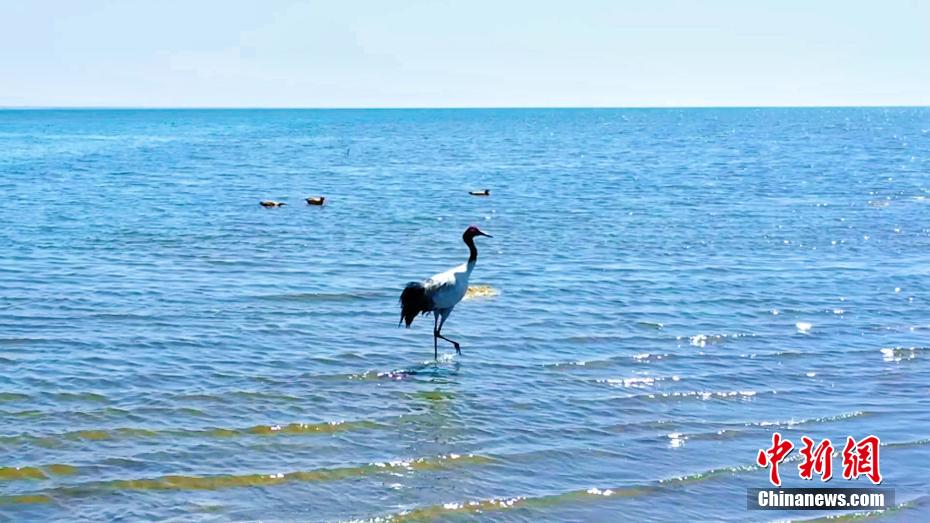 作為中國最大的內(nèi)陸湖泊,青海湖不僅是維系青藏高原東北部生態(tài)安全的重要水體、控制西部荒漠化向東蔓延的天然屏障,也是中亞、東亞兩條候鳥遷徙路線的交匯點(diǎn),是中國境內(nèi)候鳥繁殖數(shù)量最多、種群最為集中的繁殖地。圖為在湖邊散步的黑頸鶴。 張世偉 攝