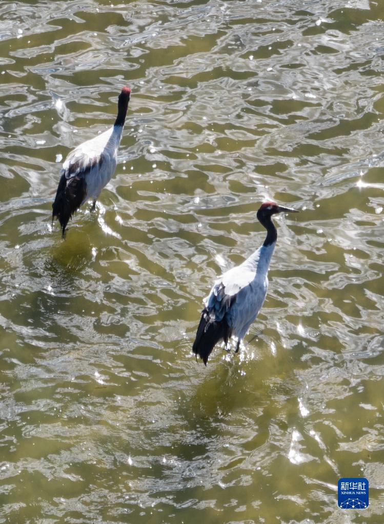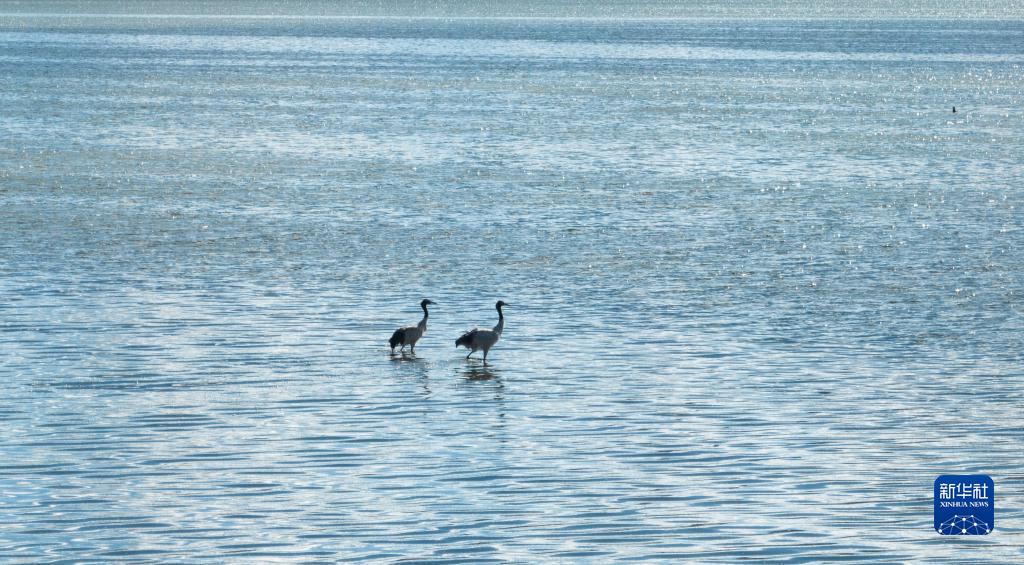 9月16日在多慶湖邊拍攝的黑頸鶴(無(wú)人機(jī)照片)。新華社記者 晉美多吉 攝