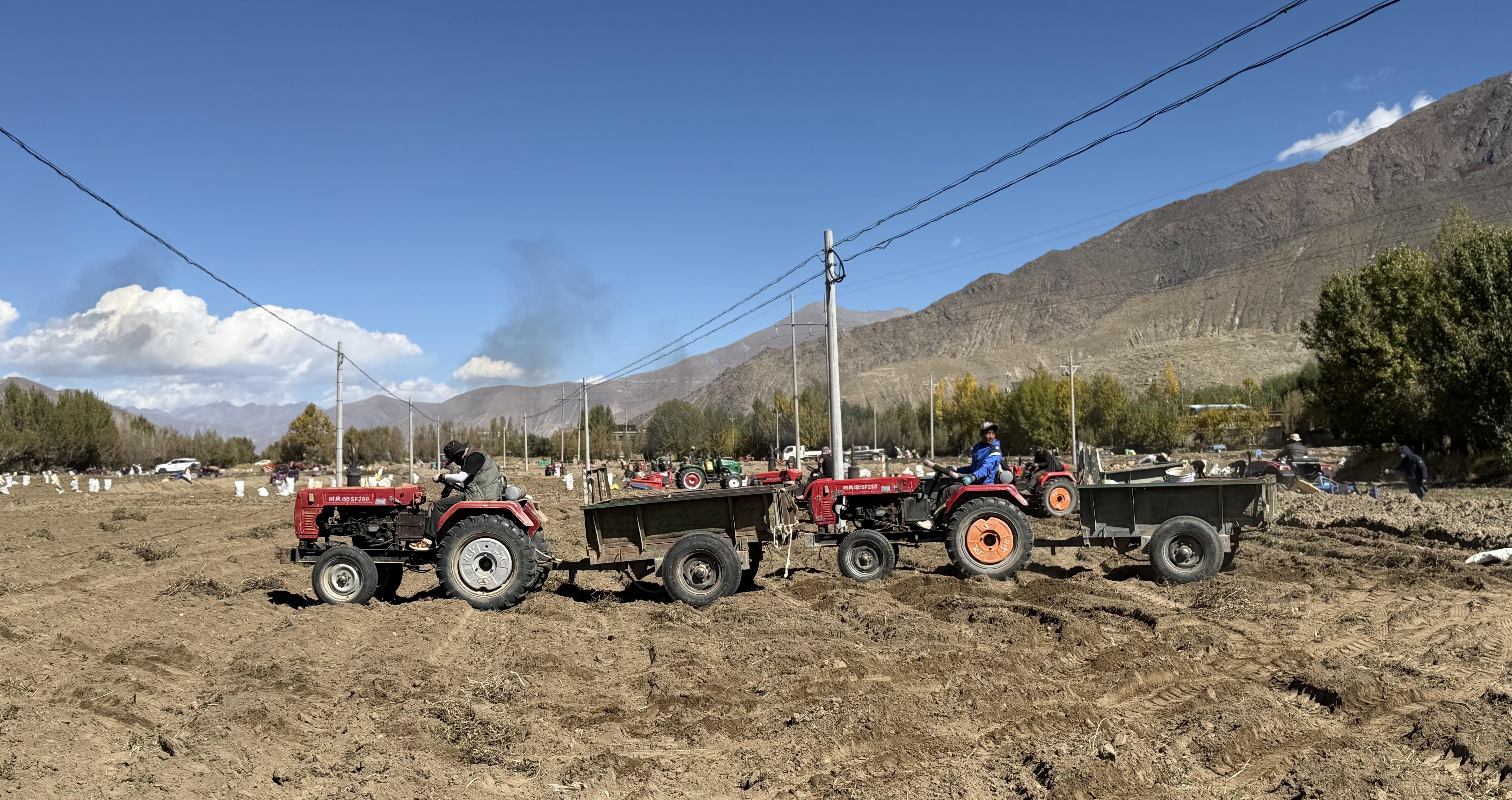 圖為南木林縣艾瑪鄉(xiāng)山巴村村民正在使用機械收獲土豆