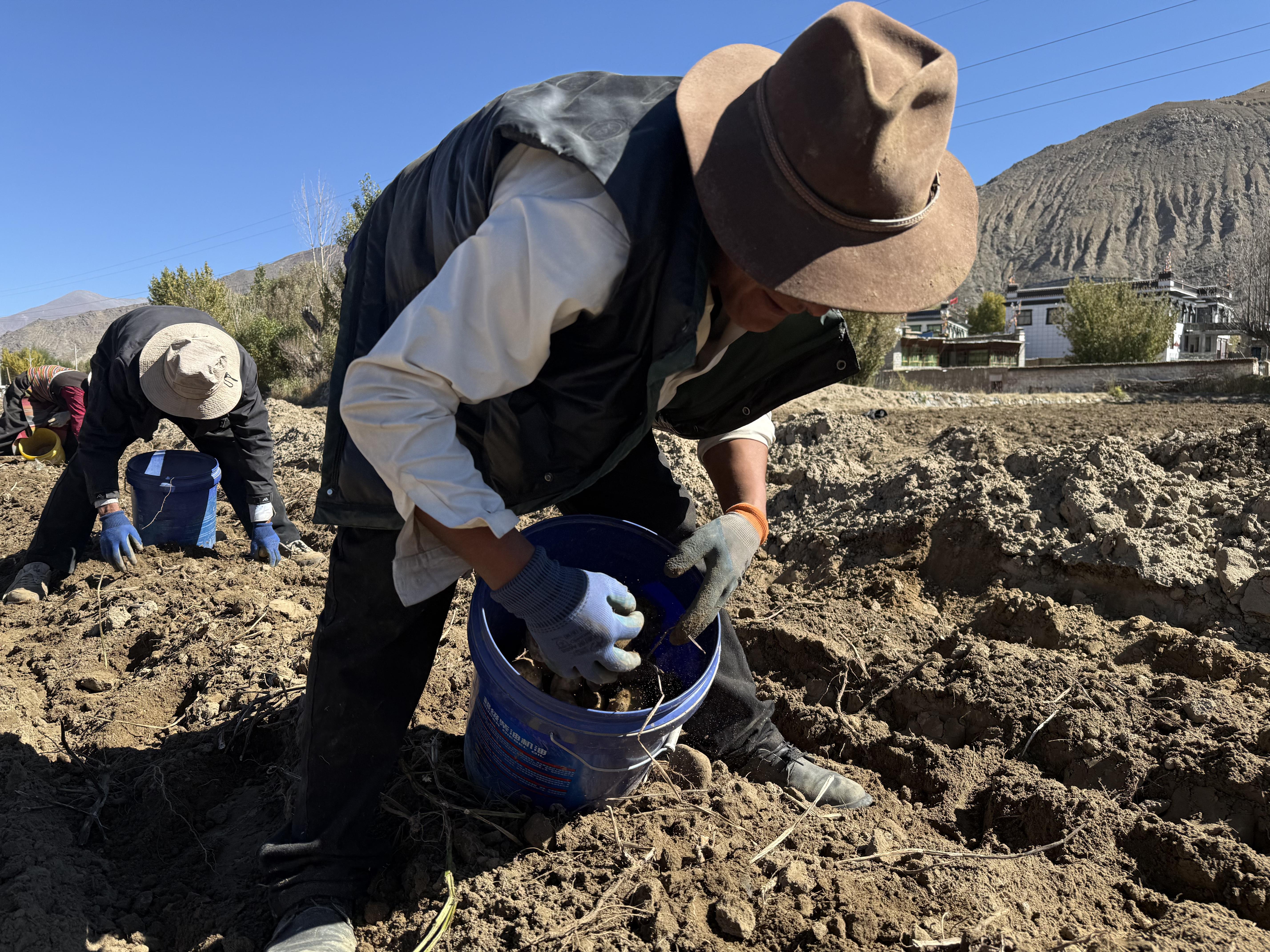 圖為南木林縣艾瑪鄉(xiāng)山巴村村民正在收獲土豆