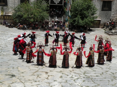 由于藏傳佛教的影響,很多藏文化帶有宗教色彩。在藏族舞蹈中,“羌姆”(俗稱 “跳神”)屬于最為重要的宗教類別寺院祭祀性舞蹈。每逢重大宗教節(jié)日,西藏僧侶們便穿起彩袍,戴上面具,佩彩帶和刀盾,伴著牛角號(hào)、嗩吶等樂器跳起威武莊嚴(yán)的“羌姆”。圖為山南地區(qū)桑耶寺僧人 “羌姆”表演。圖片來源:中新網(wǎng)