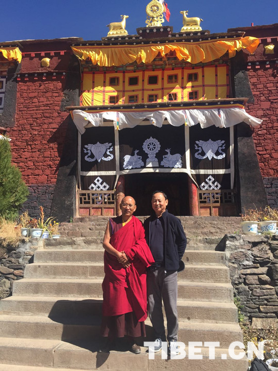 圖為豆格才讓(右一)在藏區(qū)調(diào)研時(shí)與僧人合影