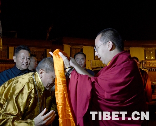 十一世班禪乘車抵達(dá)大昭寺時法號齊鳴、鼓樂喧天。早已迎候在此的中國佛協(xié)西藏分會會長珠康?土登克珠向十一世班禪敬獻(xiàn)哈達(dá),表達(dá)僧眾對他的衷心擁戴。