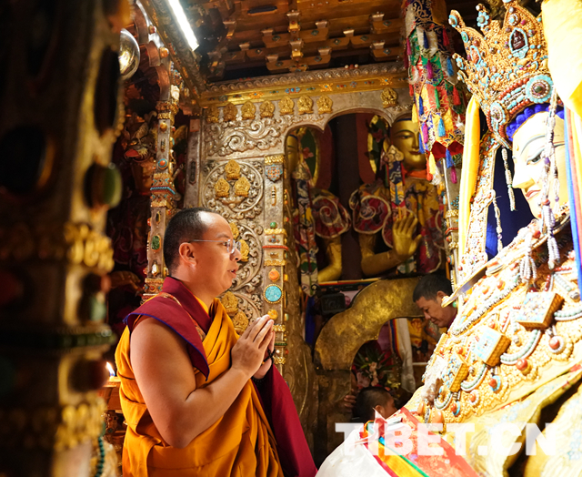 十一世班禪來到釋迦牟尼佛像前,虔誠而莊重地向釋迦牟尼十二歲等身佛像叩頭朝拜,并念誦經(jīng)文。隨后,十一世班禪手持哈達(dá)徐徐走到釋迦牟尼佛像前,雙手合十祈福,向佛像敬獻(xiàn)哈達(dá),并為佛像面部涂繪金粉。