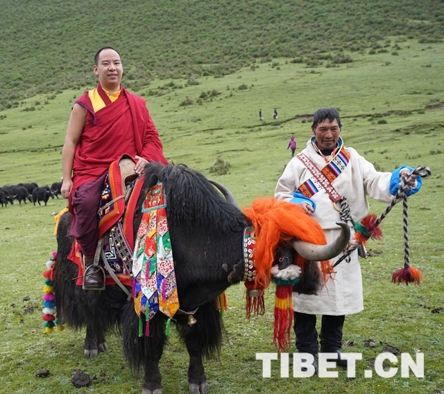 陽光雨露滋潤下,夏季的牧場上到處呈現(xiàn)出翠綠欲滴、生機(jī)勃勃的景致,鮮艷的野花與成群的牦牛更是給綠草如茵的牧場鑲嵌上靚麗的花邊。考察完雪林斯布牧場專業(yè)合作社后,十一世班禪一行來到放牧點(diǎn),考察調(diào)研夏季牧場放牧點(diǎn)等情況。在這里,十一世班禪即興策馬徐行,展現(xiàn)出活力青春、風(fēng)華正茂的一面。
