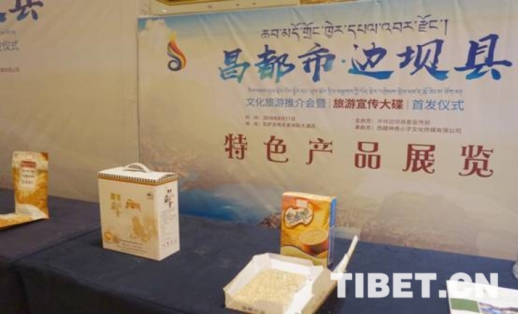 昌都邊壩旅游文化宣傳電視音樂(lè)專輯《醉美三色湖?吉祥邊壩》首發(fā)儀式暨文化旅游推介會(huì)現(xiàn)場(chǎng)展示的當(dāng)?shù)靥厣a(chǎn)品。攝影:扎西