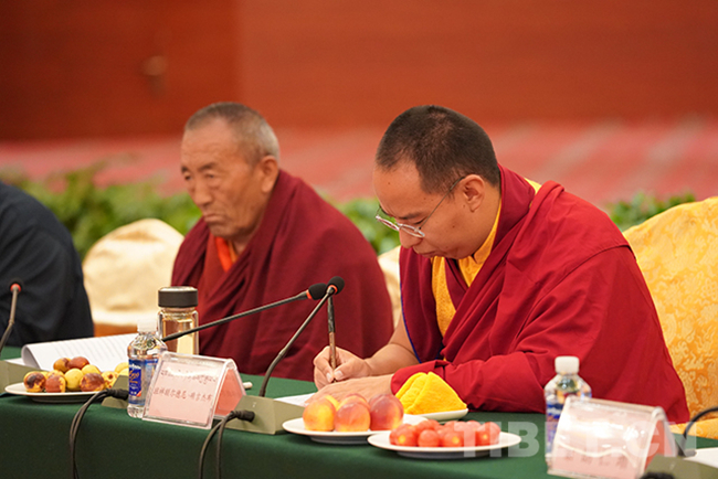圖為十一世班禪認(rèn)真聆聽山南市宗教界代表人士發(fā)言,并不時記錄。攝影:王淑