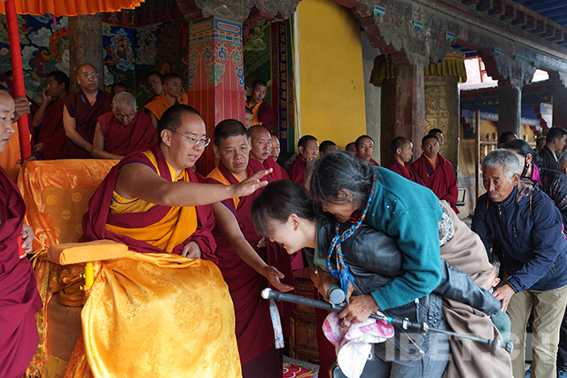 禮佛活動結(jié)束后,十一世班禪登上設(shè)在杜康殿門前的法座,為信教群眾摸頂賜福。此時,寺院外的廣場上,信教群眾已從四面八方趕來。隊伍里,有拄著拐杖的老人,有坐著輪椅來的老人,還有被年輕人背來的老人。