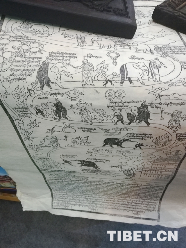 色覺的版雕拓印成品描繪的是著名的佛經(jīng)故事《調(diào)象圖》,講的是“九住心”的故事。最初,猴子在前大象在后,兩者都是黑色,經(jīng)過一路修行,漸漸脫俗出塵身體慢慢變白,但路上出現(xiàn)的桃子等寓意誘惑不斷,猴子經(jīng)不住誘惑,漸漸落后于大象,最終未能修得正果。通過連環(huán)畫的形式,講述了深刻而富有內(nèi)涵的故事,大象、猴子和僧人惟妙惟肖的肢體語言和特色鮮明的形象傳遞出一個包羅萬象的世界,令人驚嘆不已。