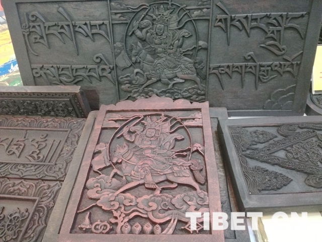 作為西藏自治區(qū)級非遺傳承人之一的色覺,和其他幾位非遺傳承人一道,帶著他們的作品前來參展。這一次,他的3件精品版雕拓印作品入選,被放在西藏展廳入口處的展示臺作為重點參展作品。