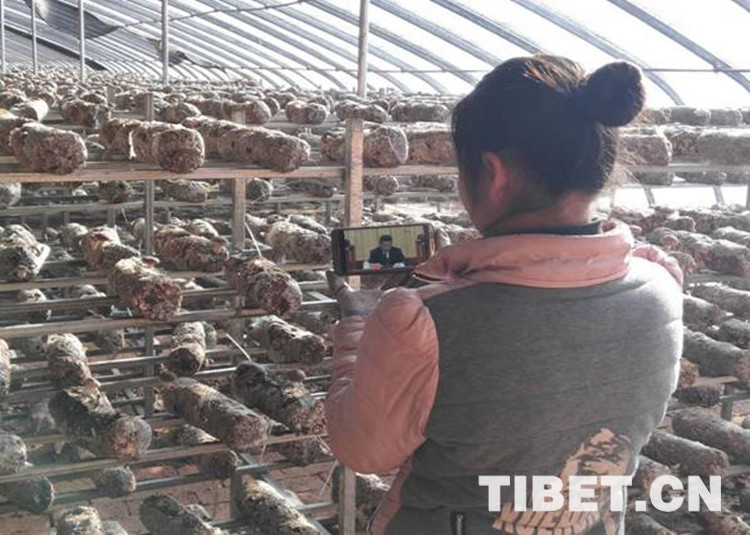圖為天祝臣祥菌業(yè)科技公司職工在生產(chǎn)一線收看大會盛況