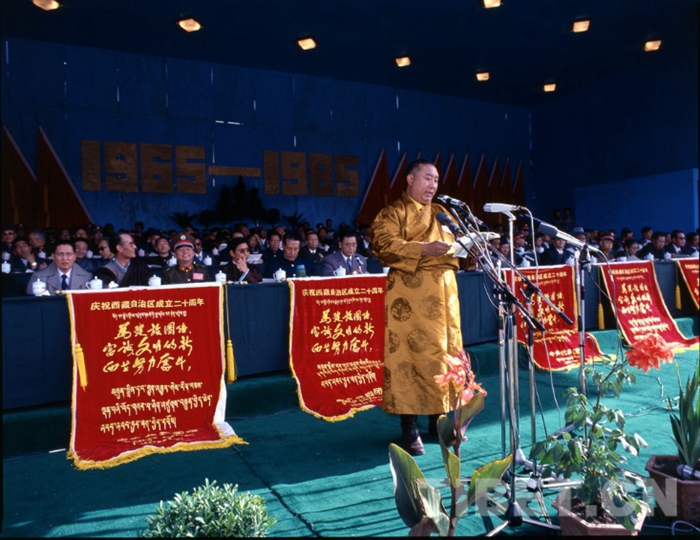 十世班禪大師在西藏自治區(qū)成立20周年慶祝大會(huì)上講話,1985年。劉麗嘉攝