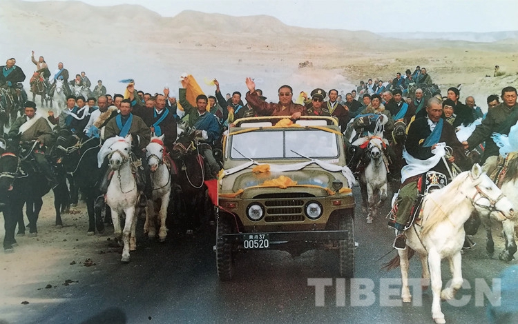 當十世班禪大師在原青海省人大常委會副主任夏茸尕布、原海南州委書記東主加的陪同下,乘敞篷車從幸福灘來到海南州州府所在地恰卜恰鎮(zhèn)時,各族人民群眾身著節(jié)日盛裝,載歌載舞,熱烈歡迎十世班禪大師。十世班禪神采奕奕,精神飽滿,高興地向各族群眾招手致意。