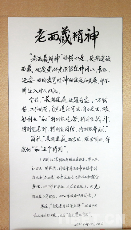 圖為陰法唐、李國(guó)柱家中懸掛的“老西藏精神”內(nèi)涵書(shū)法作品。