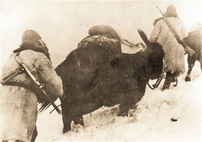 圖為先遣連官兵們拽著牦牛的尾巴上雪山。圖片來(lái)源:解放軍報(bào)