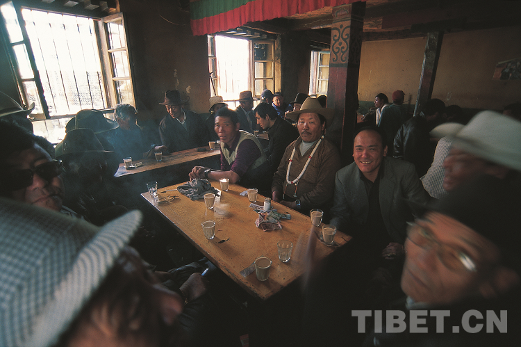 近幾十年,拉薩又興起飲一種由印度傳來的“甜茶”,原料是來自印度或我國云南的紅茶,加鮮奶和糖煮成,味道甜爽滑膩。不管是老年人還是年輕人,大家都喜歡聚在甜茶館里,因?yàn)槟抢锊粌H可以喝茶,還是一個(gè)聊天交流的場(chǎng)所。那也是我的最愛,光明甜茶館、革命甜茶館都是我常去的地方。走累了就隨便走進(jìn)一家路邊的茶館,先和身旁的人點(diǎn)頭笑笑,然后在他們身邊擠著坐下,一把零錢往桌子上一放,送茶員就會(huì)拎著茶桶和小玻璃杯過來,給你倒上一杯茶,然后數(shù)走茶錢。如果你沒有零錢,送茶員會(huì)自行找好零錢放回你面前的桌上。雖然聽不懂藏語,但我很享受這種地道的氛圍,于是常常在甜茶館里待著。
