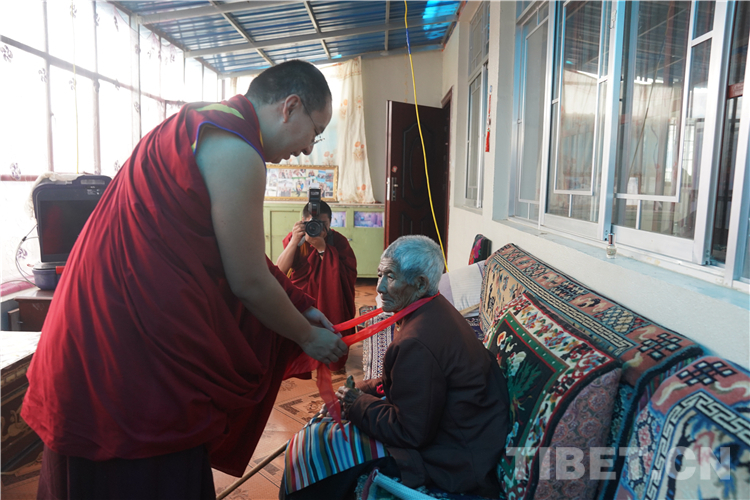 圖為十一世班禪為旺堆平措家中長(zhǎng)輩系上長(zhǎng)壽金剛結(jié) 攝影:王淑