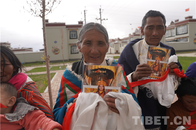 圖為甲崗村農(nóng)牧民群眾手捧十一世班禪法像照片。 攝影:王淑