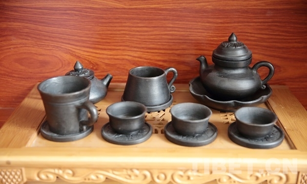 圖為班瑪縣電子商務(wù)服務(wù)中心內(nèi)展示的黑陶茶具 攝影:楊月云