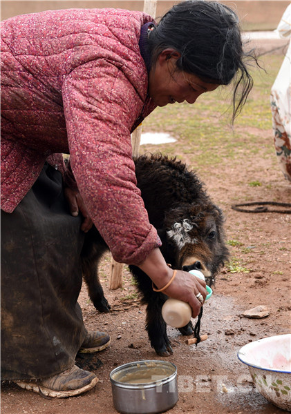 圖為雙湖嘎措鄉(xiāng)才達卓瑪每天用嬰兒奶瓶在給被狼咬死、失去媽媽的小牛犢喂食。(唐召明2017年7月26日攝)