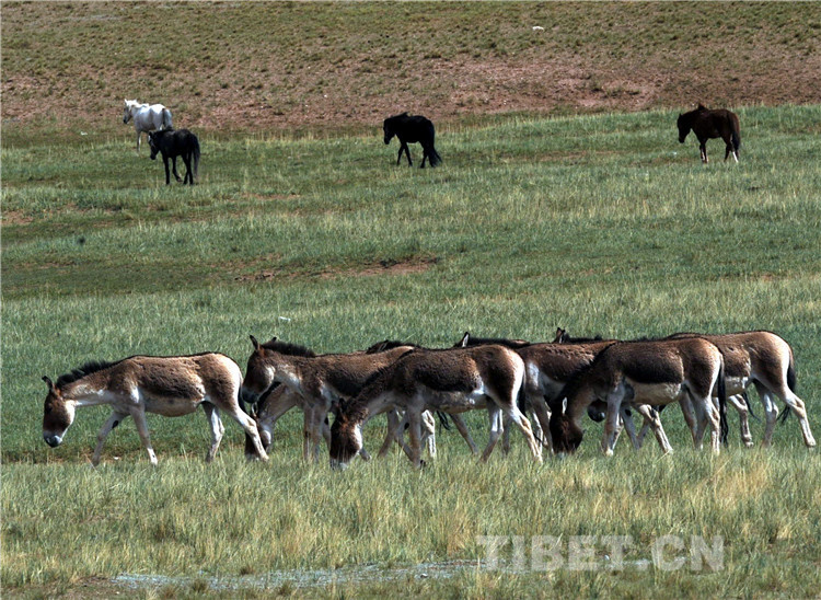 圖為生活在羌塘國家級自然保護區(qū)的國家一級保護動物藏野驢(前)在草原上與牧民放牧的馬匹(后)一同在草原上吃草。(唐召明2014年7月17日攝)