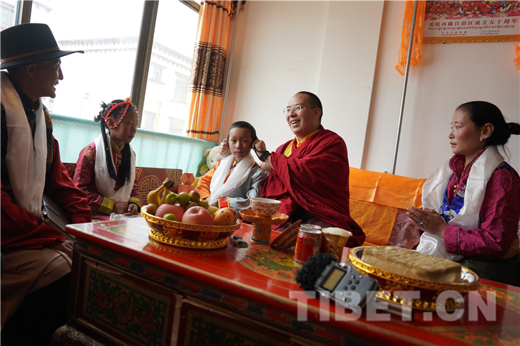 安多縣的帕巴多吉老人今年70歲,聽說十一世班禪要回家鄉(xiāng),整天拿著念珠算日子,今天這吉祥的日子,老人家終于如愿以償,得到長壽灌頂,摸頂賜福。帕巴多吉老人雙手合十,開心幸福得像個孩子,連連致謝。嘴里念叨著“如愿了、如愿了”。