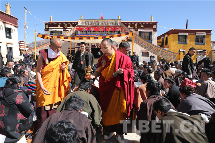 那曲市孝登寺由活佛洛桑尊珠?丹白嘉措始建,距今已近200年歷史。8月9日,十一世班禪前往孝登寺禮佛朝拜,抵達孝登寺后,珠康?土登克珠活佛向十一世班禪敬獻哈達。隨后,十一世班禪登上寶座帶領僧眾集體誦經祈福,為寺廟僧眾和早早在此等候的信教群眾舉行長壽灌頂、摸頂賜福,為僧俗信眾發(fā)放長壽金剛結、長壽丸等。