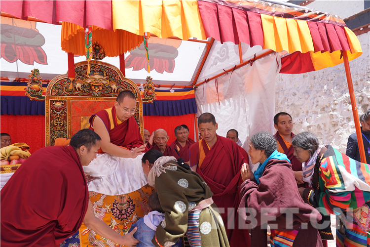 得知十一世班禪要來,草原上的信教群眾把家中最華貴的衣服都穿在了身上。摸頂中,有信眾請十一世班禪吹一吹眼睛或撫摸傷痛處,十一世班禪總會盡心滿足。