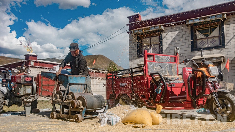 圖為村民正在用機(jī)器將殘留的青稞殼與青稞分離 攝影:趙耀