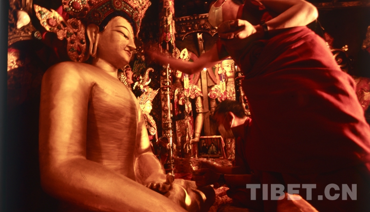 藏族朋友們認(rèn)為,刷金不僅能給佛像增加神圣莊嚴(yán)的氣氛,更能使觀看者生恭敬清凈的心,為佛像刷金、尤其是為釋迦牟尼12歲等身像刷金的功德是非常巨大的。