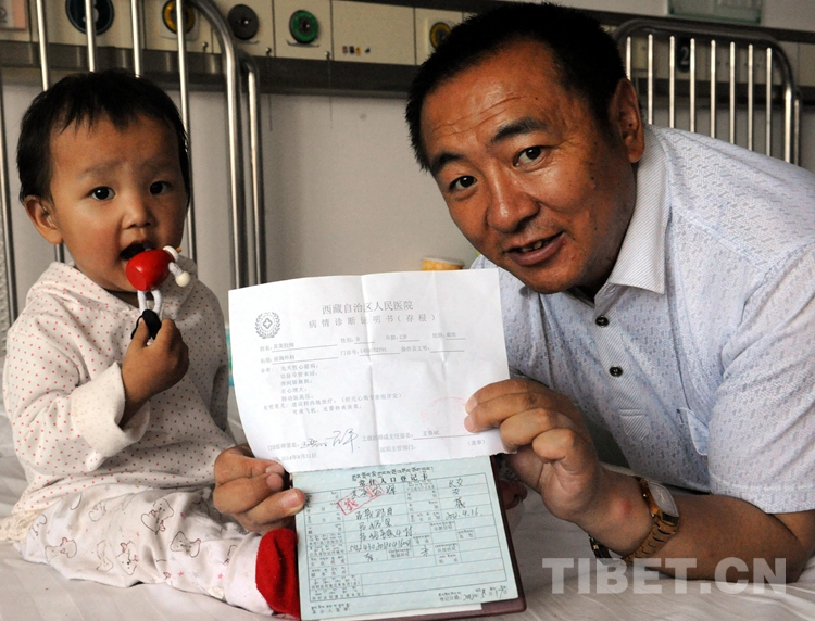 這是其美拉姆和阿爸次仁石達在北京安貞醫(yī)院小兒心臟病房。她阿爸手中展示的是她的戶口本與西藏病情診斷證明書(唐召明2014年9月9日攝)
