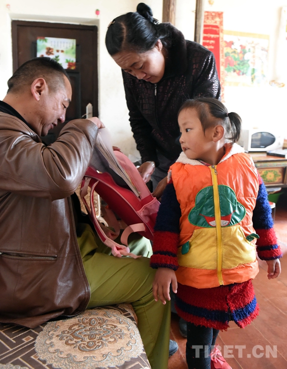 這是父母幫助術(shù)后的其美拉姆整理書包,準備送她去幼兒園。(唐召明2016年10月6日攝)