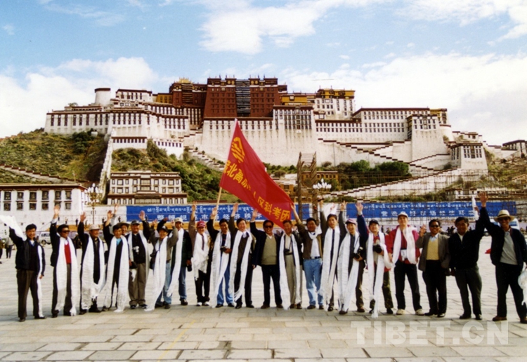 圖為藏北高原無人區(qū)科考團(tuán)人員在拉薩布達(dá)拉宮前揮旗出征無人區(qū),并合影留念(唐召明2001年6月26日攝)
