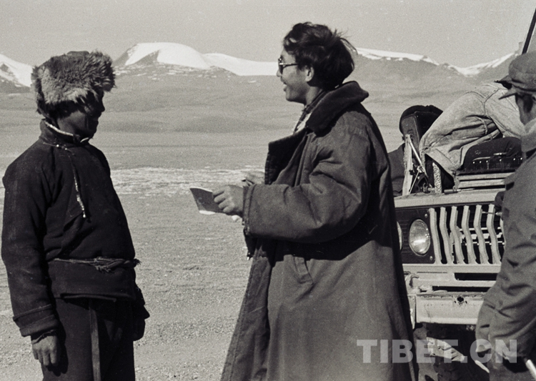 圖為唐召明獨(dú)自“二闖”藏北無人區(qū)時,所搭乘的那曲科委風(fēng)能實(shí)驗(yàn)站汽車在路途中“拋錨”,趁司機(jī)索加修車空擋,唐召明(右)采訪給他騰讓駕駛室車座,而不顧自己疑似有癲癇疾病,一路在汽車車廂里受凍的索加弟弟才旺(左)。(圖片由唐召明提供,1988年11月14日攝)