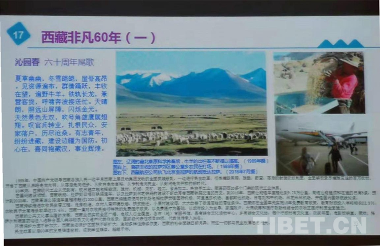 唐召明以照片敘事、詩詞抒情的形式,把西藏60多年來的發(fā)展變化和其間的感人瞬間展示出來,謳歌偉大的時代和詮釋這一偉大時代的“老西藏精神”。經北京建藏援藏協(xié)會原副會長朱強配圖賦詩,有了“百首詩詞、百張圖文”的以詩配圖資料。一張張感人的照片和一首首充滿激情的詩歌,展示了在中國共產黨的領導下,新西藏在“短短幾十年,跨越上千年”的歷史巨變;道出了一切為了西藏人民的“老西藏精神”時代內涵。全場聽眾凝神專注,不時響起熱烈的掌聲。