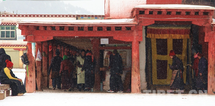 查杰瑪大殿底層外繞寺一周設(shè)有紅色的長廊,內(nèi)有無數(shù)個金色轉(zhuǎn)經(jīng)筒。圖為信教群眾們呈順時針方向有序地漫步長廊下,右手撥動轉(zhuǎn)經(jīng)筒,口中誦念經(jīng)文 攝影:李元梅