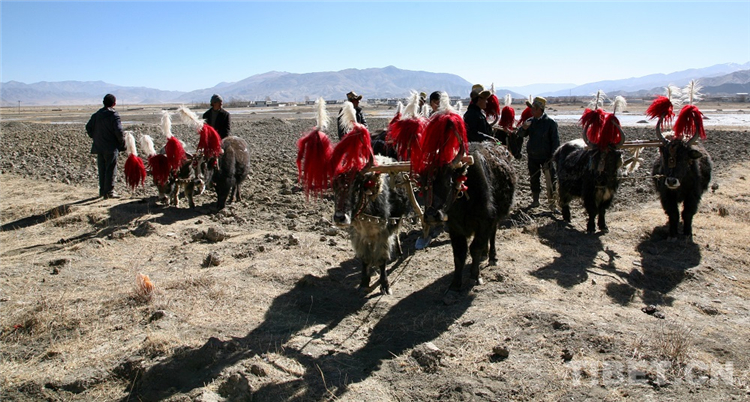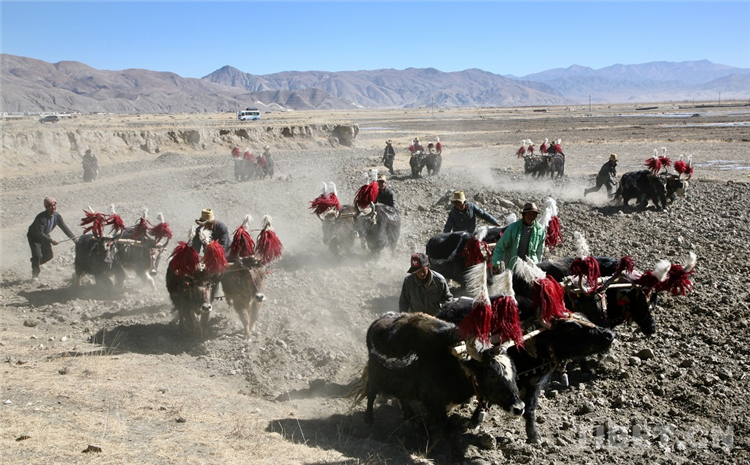 圖為日喀則的開耕節(jié),農(nóng)民們?cè)谶M(jìn)行二牛抬杠犁地比賽